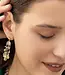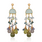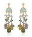 Experience a new color variation of these Marcela earrings, ideal for any occasion. Featuring black gold-plated bezeled moonstone's adorned with green and pink sapphire, and moss aquamarine teardrops, elegantly hanging in three rows.