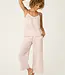 Women’s pink-and-white yarn-dye stripe pajama set crafted in lightweight woven cotton. Features a cami top with adjustable straps and inset trim. Relaxed cropped pants with an elastic waistband, drawstring tie, and side pockets.