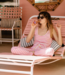 Sweet, striped, and ready to chill. This lounge set is crafted from soft peachy jersey in bold sorbet shades of pink and yellow, featuring a relaxed scoop-neck tank and matching pants. A tiny floral embroidery blooms beside the neckline, with a matching motif at the hip. The look is finished with a scoop back and two-tone orange and white drawstring—perfect for slow coffee mornings, weekend errands, or simply soaking up the sweetness of staying in.