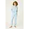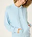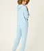 Women’s loungewear set with a hoodie and banded pajama pants in light blue melange peachy jersey, finished with contrast white whipstitch detailing, an elastic waistband, and elasticized hems.