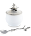 Imbue your kitchen with the rustic elegance of Vagabond House's Pomegranate Sugar Bowl and Spoon from the Farmer's Market Collection. Crafted from fine porcelain, its luminous white finish beautifully contrasts with the luxury grade pewter lid and sugar spoon. Ideal for lovers of tea and unique tableware, its compact size makes it a perfect addition to your coffee or tea service.